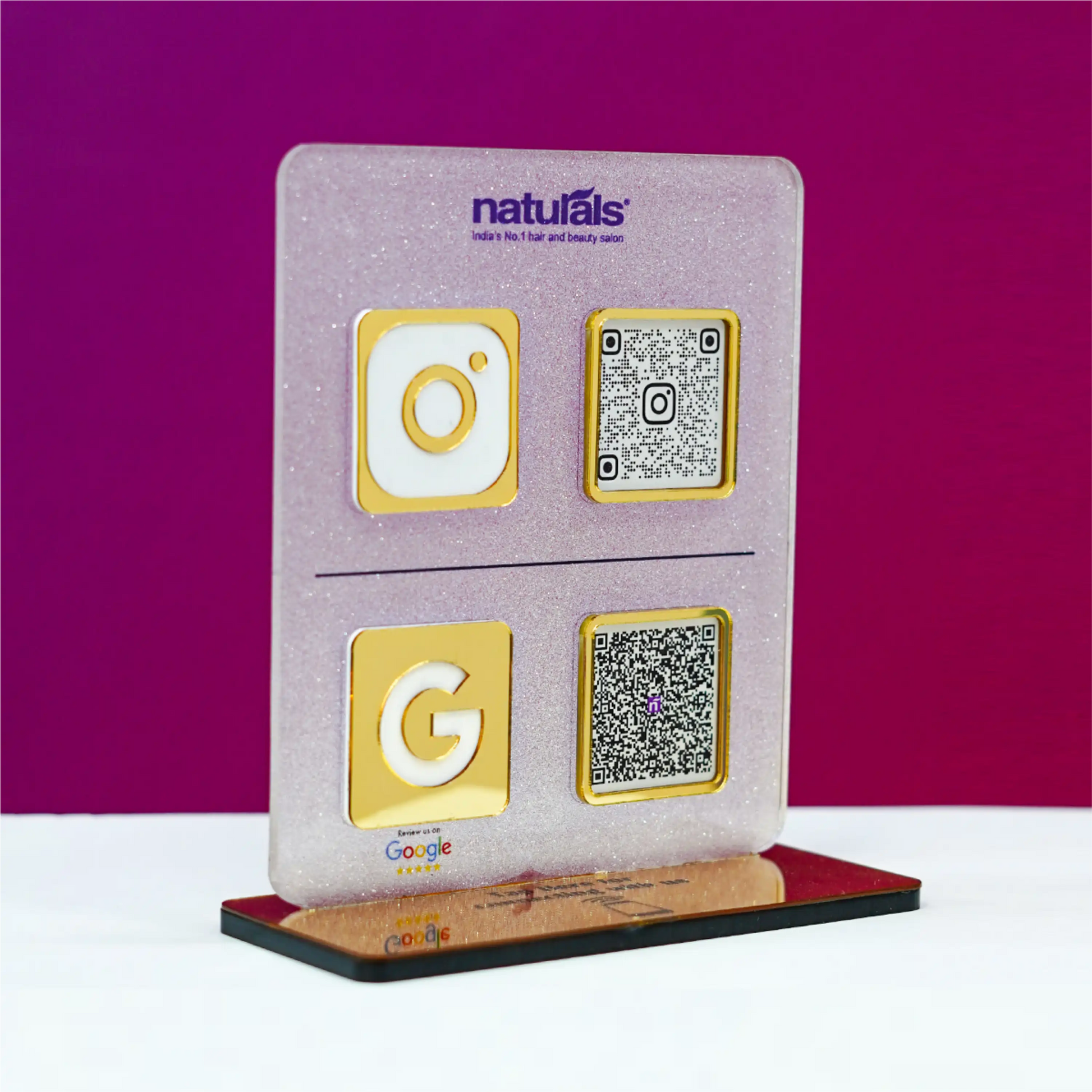 Introducing the ConnectHub Pro, the ultimate 4-in-1 social media scanner and display solution. Designed for seamless integration into any business setting, this innovative board stand combines the power of NFC technology with the versatility of QR code scanning, all in a compact and efficient 7.5x6 inch size. Crafted from premium materials including wood veneer and acrylic, the ConnectHub Pro is not only functional but also adds a touch of sophistication to your space.