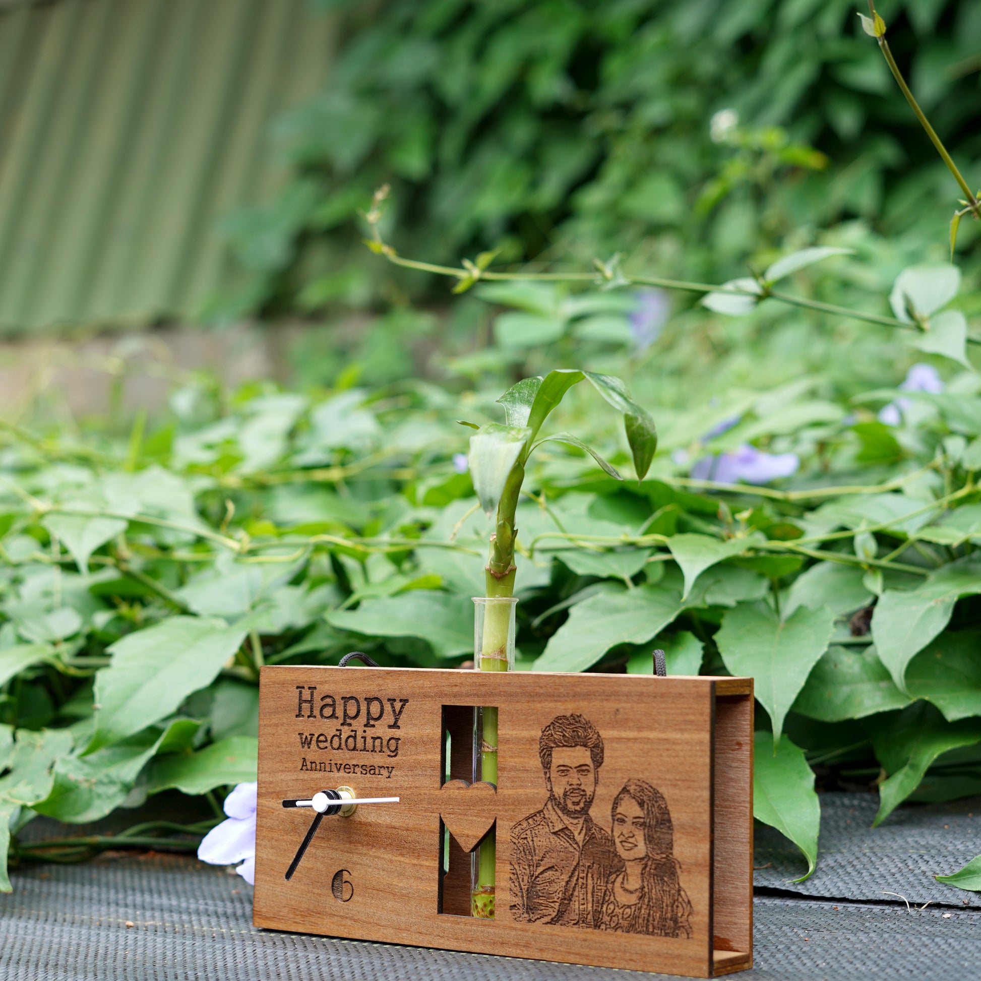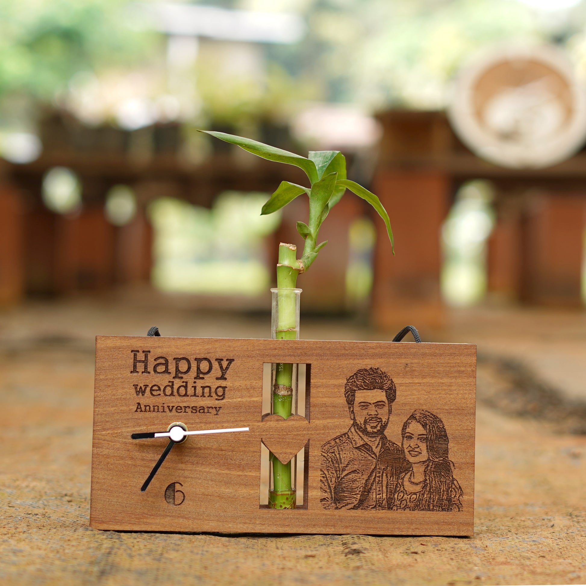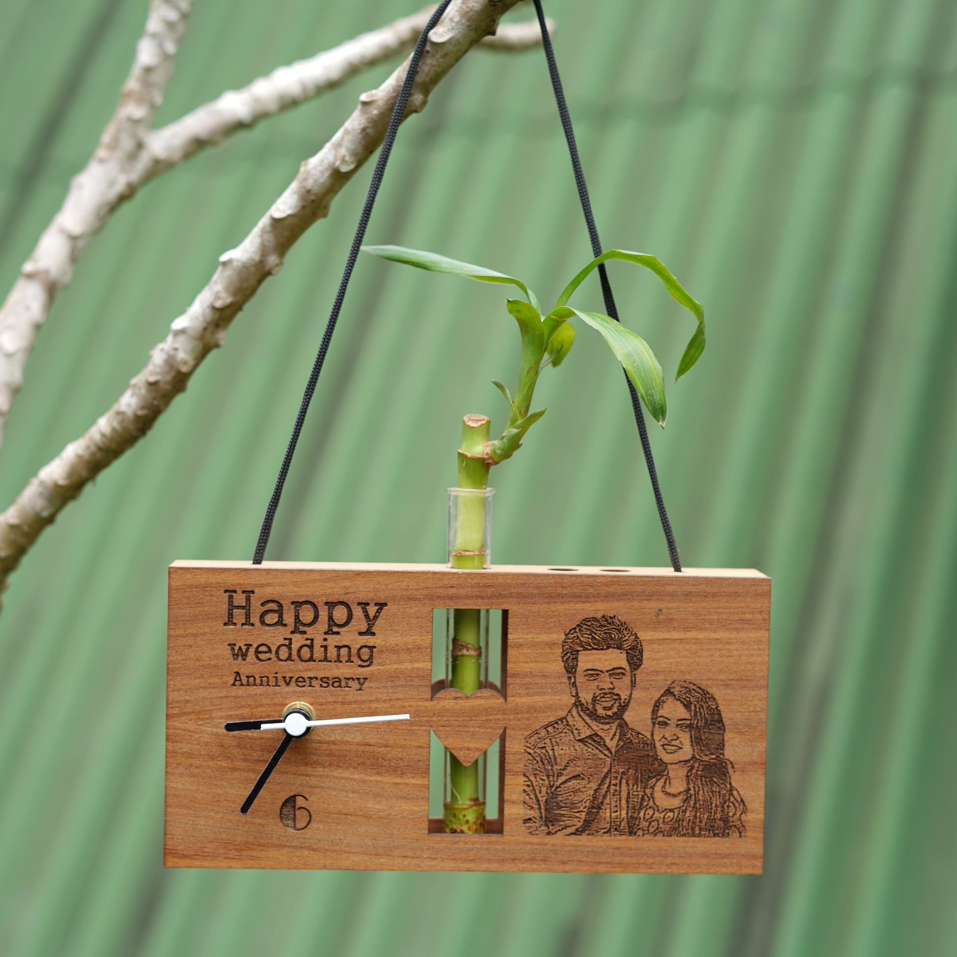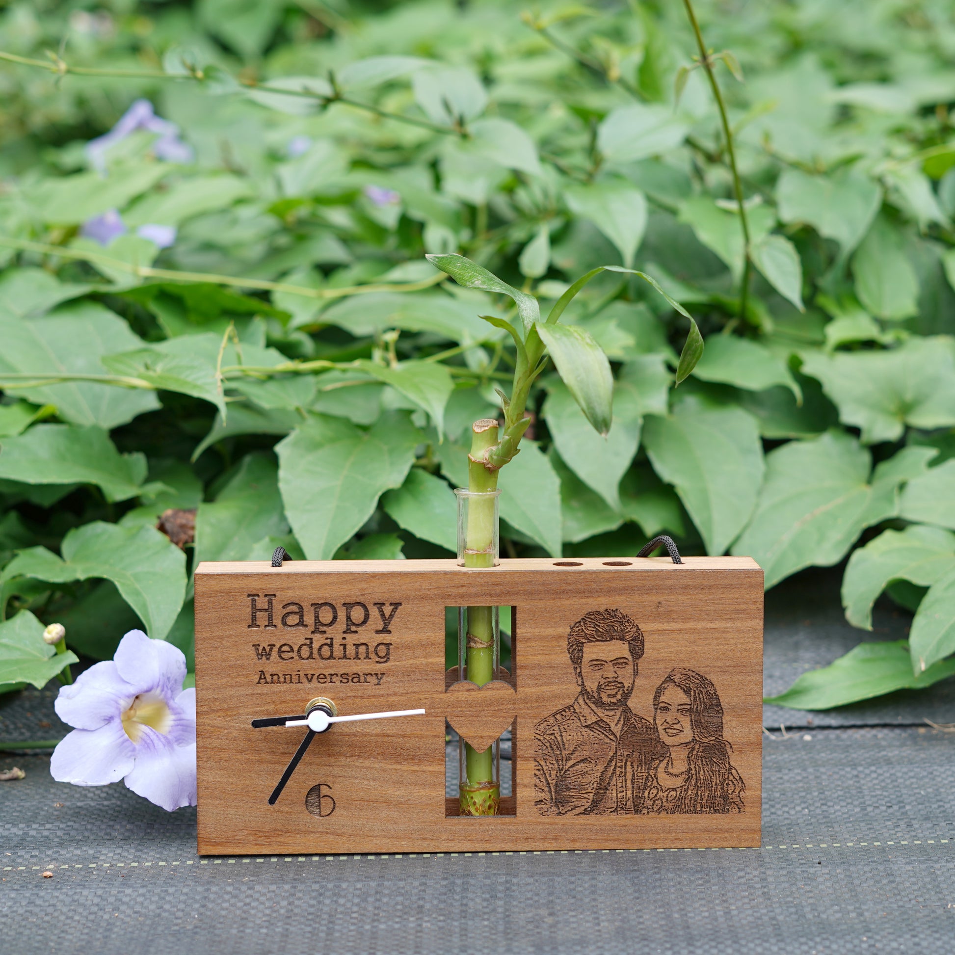 Photo Engraved Personalized Wooden Table Clock With Plant Vase