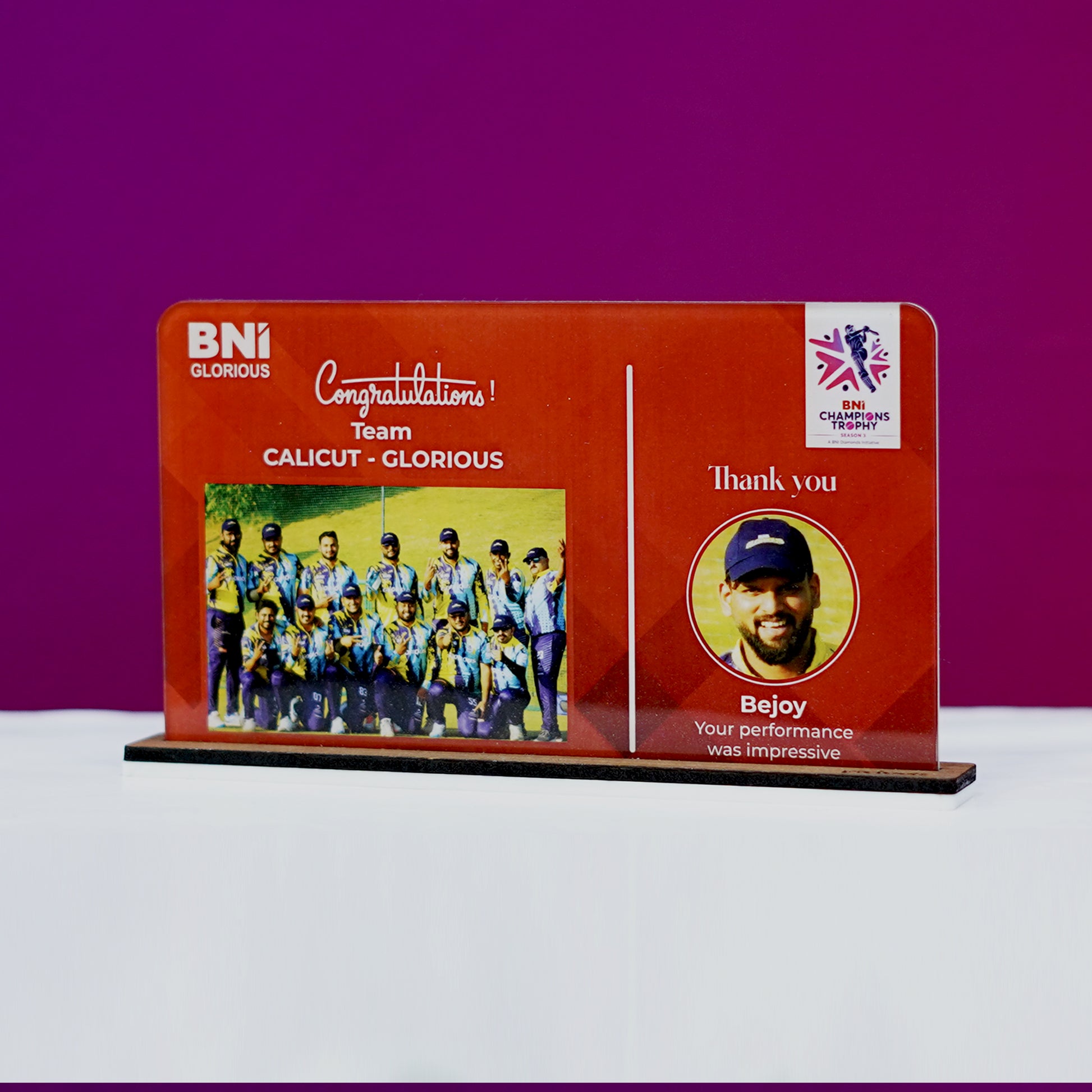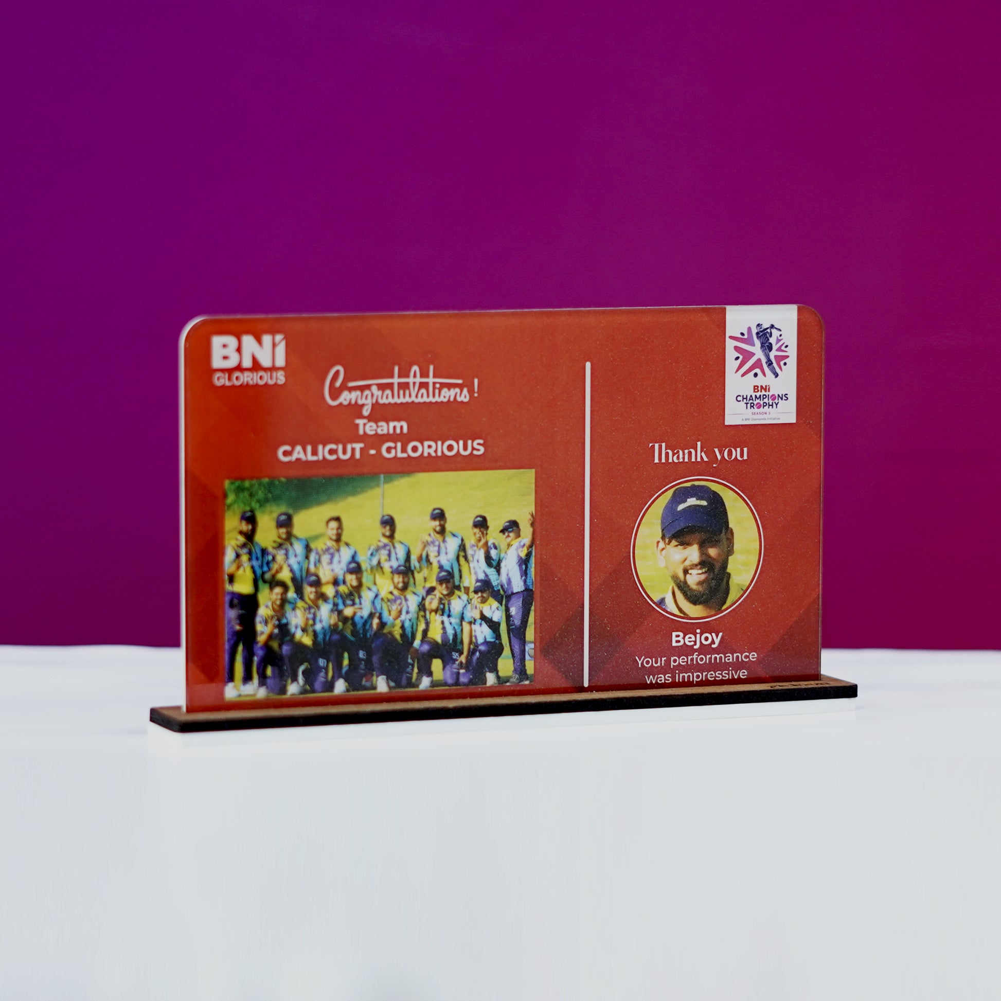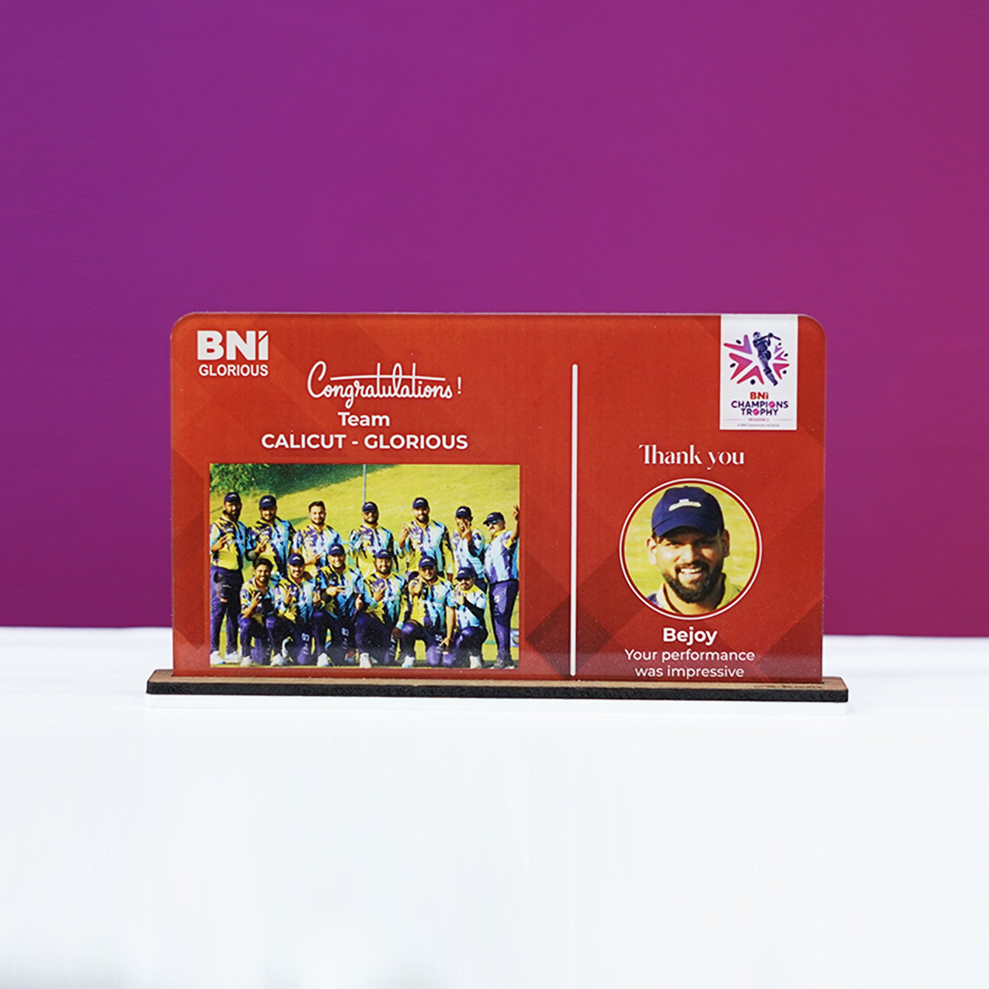 Material: The memento features a high-quality acrylic base that provides a crystal-clear surface, giving it a sleek and contemporary look. It is complemented by a veneer wood finish, adding a touch of classic elegance and warmth to the design.