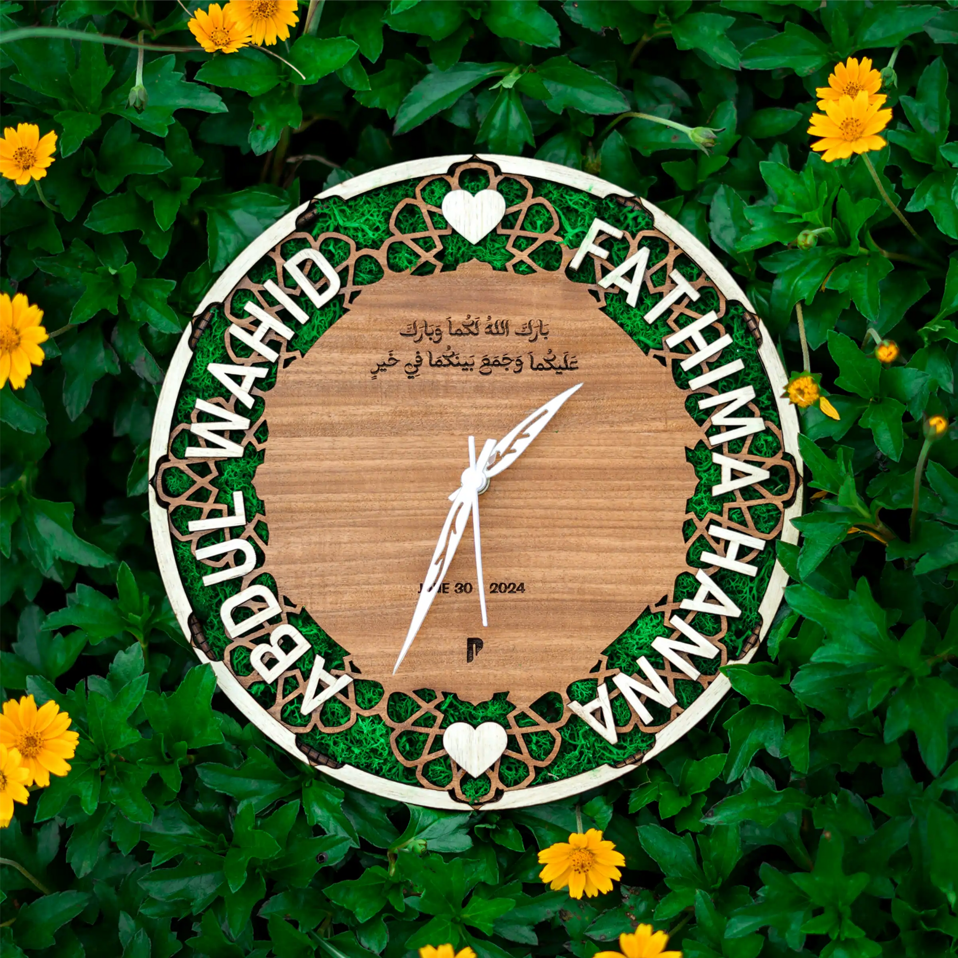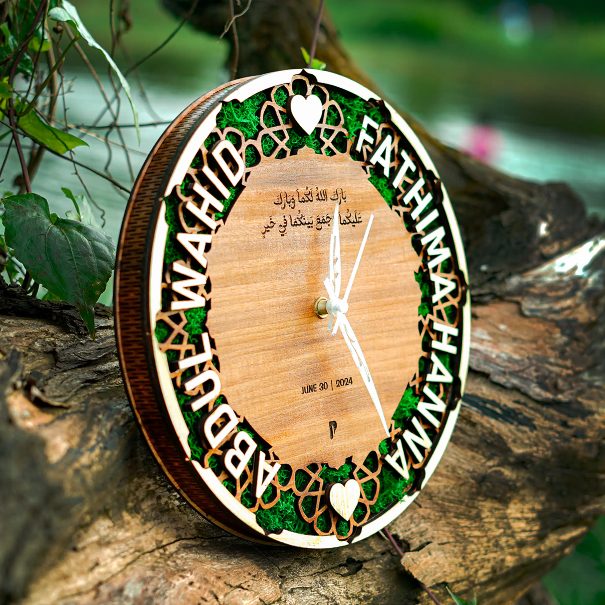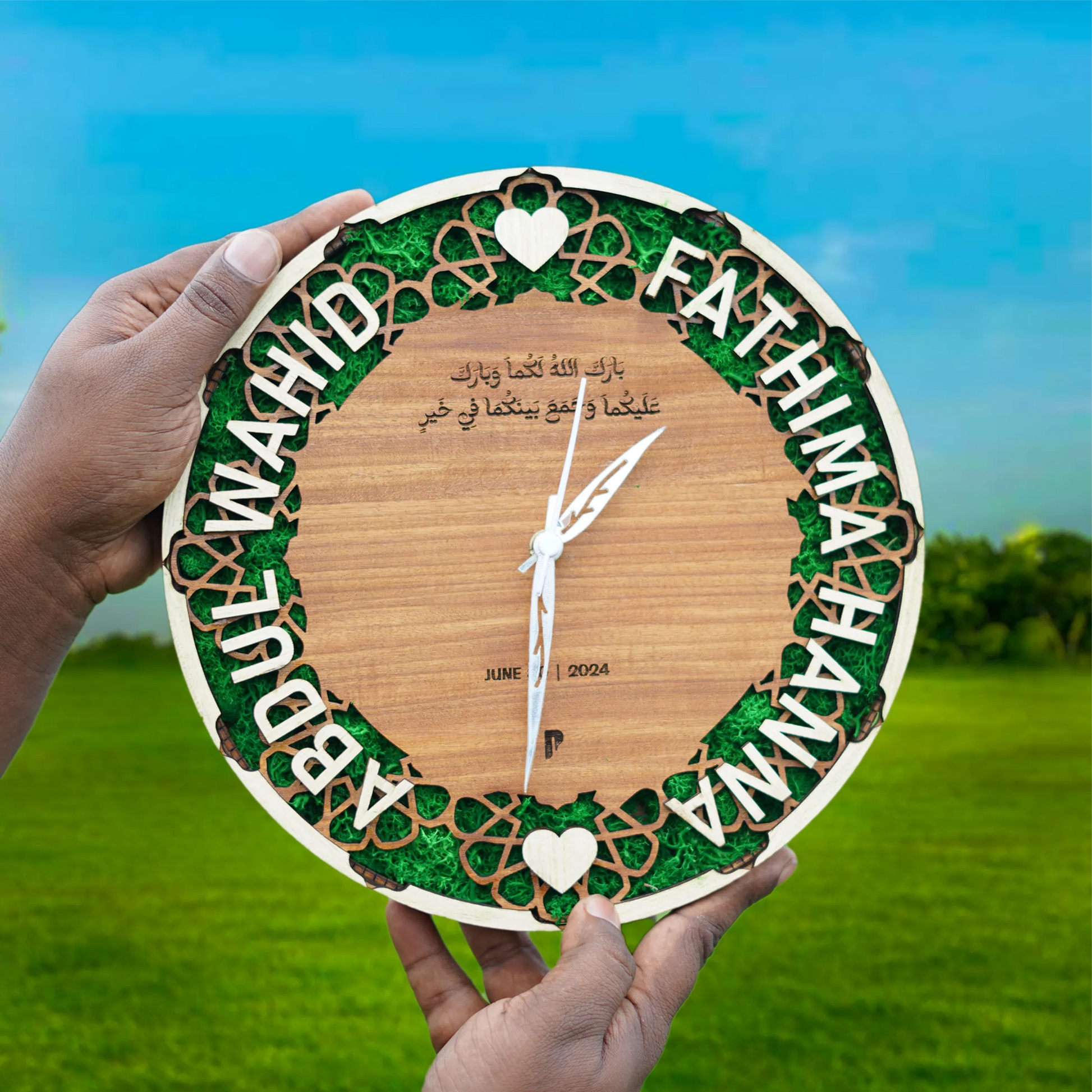 The highlight of this clock is its personalized name customization feature. Whether you're looking to add your family's name, a special date, or a meaningful word, our skilled artisans will carefully engrave your chosen text onto the wooden surface, ensuring a bespoke and personal touch. This makes the Moss Wooden Clock an ideal gift for housewarmings, weddings, anniversaries, or any special occasion.